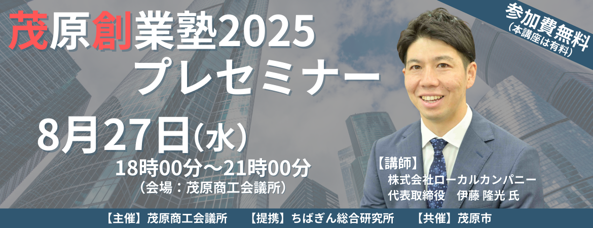 茂原商工会議所は、市内での創業を目指す方や事業後継者の方を対象に『茂原創業塾2025』を開催するにあたり、『茂原創業塾2025プレセミナー』を開催いたします。